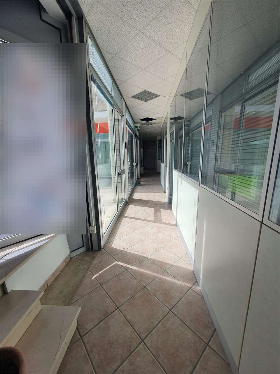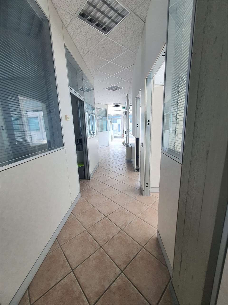 Lo spazio interno risulta suddiviso tramite l'utilizzo di pareti da ufficio prefabbricate in 7 singoli uffici dotati di finestre o grandi vetrate, al... Vedi di più