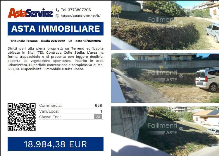Immobilimpresa 10935447 – Riferimento Agenzia Tribunale Teram – Diritti pari alla piena proprietà su Terreno edificabile ubicato in Silvi (TE), Contrada Colle Stella. L'area ha forma trapezoidale e si presenta con leggero declivio, coperta da vegetazion... Vedi di più